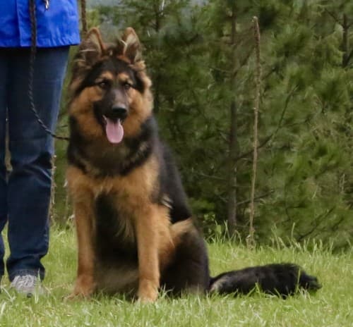 A-Stamp for hips and elbows, DM ClearRose is the pup we kept out of Macho (Internationl Champion Macho Vom Haus 2nd Hillsview BH) and Mokka (Mokka vom Kistha Haus). Her notable siblings include Ryker von Hoffnung CD, High Scoring Obedience Dog at the Spokane Dog Training Club Trial in 2015 and Quinn von Hoffnung, a highlight of Dallas dog events. Rose, herself, is a dedicated Tracking Dog. Her personality is sweet, affectionate, and calming.