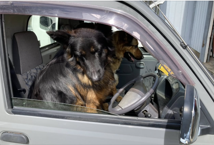 Rip, is their black and red long coated German Shepherd from Candle Hill. His parents are Kip and Hazel. We're not sure when he learned to drive, but he should look where he is going. LOL